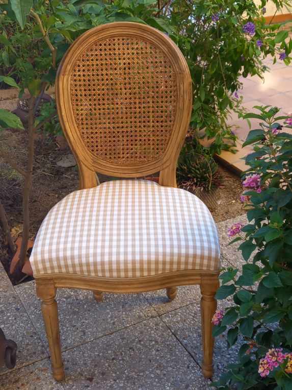 Un travail artisanal : dépose de l’ancien tissu, et pose d’une toile vichy sur assise pour redonner tout son charme à ce fauteuil ancien.